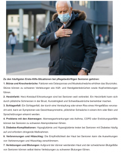 Hilfe erfordern. Daher ist es für Pflegende sehr wichtig, stets auf solche Notfälle vorbereitet zu sein.Lebensbedrohliche Zustände wie Herzinfarkte und Schlaganfälle, die bei Senioren häufig auftreten, erfordern ein sofortiges und präzises Eingreifen. Stürze und Knochenbrüche sind ebenfalls häufige Notfälle und die richtige Erste Hilfe spielt eine entscheidende Rolle bei der Vermeidung schwerer Verletzungen.Atemnot und Erstickungsanfälle sind ebenfalls lebensbedrohliche Situationen, die eine schnelle und wirksame Erste Hilfe erfordern. Chronische Erkrankungen wie Diabetes und Hypoglykämie können bei Senioren zu plötzlichen Gesundheitsproblemen führen, so dass es wichtig ist, dass Pflegende mit diesen Situationen umgehen können. Auch Verletzungen und Blutungen können ihnen schwerwiegende Folgenhaben und die in solchen Notfällen anzuwendenden Erste-Hilfe-Maßnahmen sind von entscheidender