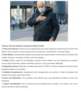 In the care of elderly individuals, encountering specific situations and conditions that require first aid is
