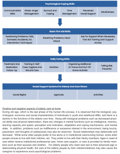 This booklet consists of four basic sections as shown in the diagram below. These sections contain information about psychological skills, basic first aid skills, daily elderly care skills and social support systems in project partner countries that will contribute to the empowerment of caregivers.