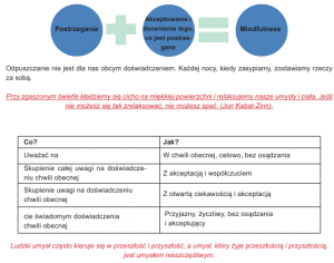 wydarzeniach, które dzieją się w danej chwili, z delikatną, nieoceniającą uwagą. Z tej formy monitoringu